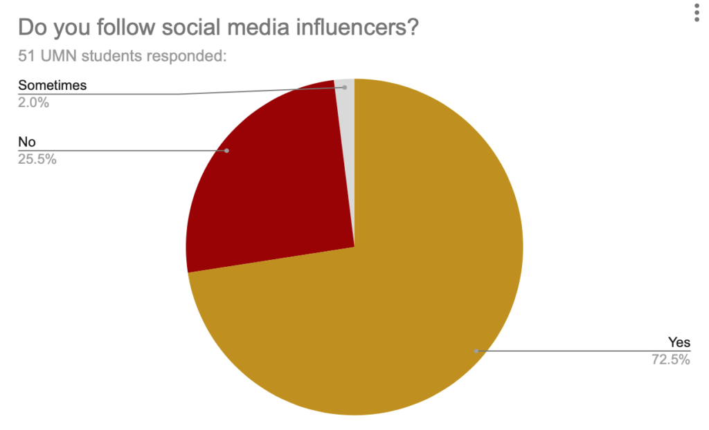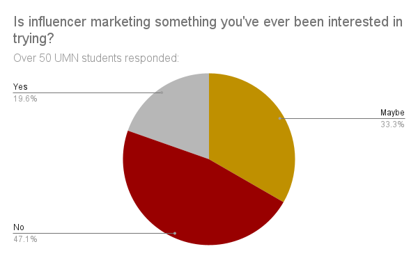 Minnesota, not exactly a state known as an influencer destination, reflected these nationwide statistics. We sent out a survey on how Gen Z uses social media, more than half of University of Minnesota students and recent graduates said that they follow social media influencers. However, about half of the respondents stated they do not see influencer marketing as a viable income source that will last.